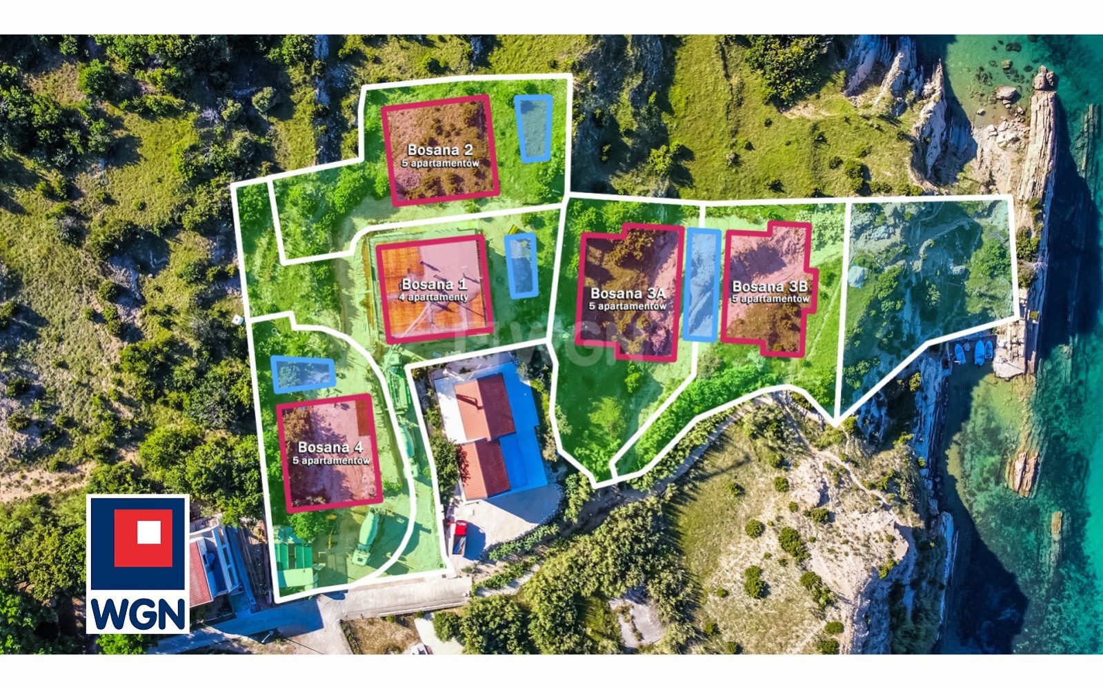 Cztery apartamenty każdy o powierzchni 94,48 m2 wraz z tarasem, w jednym budynku, wspólny basen, parking dla czterech samochodów. Niezakłócony widok na morze z wykorzystaniem przesuwnych okien typu HS. Dwie sypialnie, salon z aneksem kuchennym, łazienka i toaleta w każdym apartamencie.
